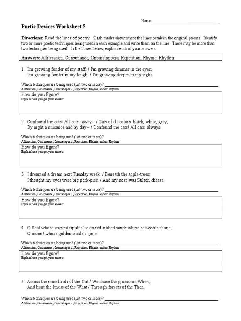 Here are 10 problems to give you or your students practice with poetic devices. Sign, fax and printable from pc, ipad, tablet or mobile with pdffiller ✓ instantly. Here is a collection of worksheets on poetic devices to give you or your students rapid fire practice with this skill. Poetic devices worksheet 1 | answer key 1. Browse poetic devices worksheet resources on teachers pay.